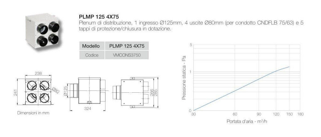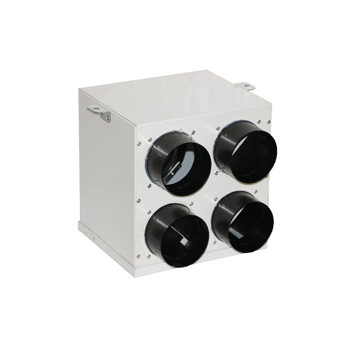 Horganyzott acéllemezből készült központi hővisszanyerős szellőztető rendszereknél alkalmazható osztó - gyűjtő elem 1 db 125 mm-es átmérőjű csőcsatlakozással és 4 db 75 mm átmérőjű csatlakozással, akusztikus szigeteléssel. A 125 mm-es csatlakozás a központi szellőztető készülékkel köthető össze ugyanilyen átmérőjű légtechnikai csővel, a kisebb méretű csatlakozási pontokat az egyes befúvási vagy elszívási pontokkal köthetők össze 75 mm külső átmérővel rendelkező, a kívánt méretben méretre vágott antibakteriális és antisztatikus légtechnikai csövekkel. Ez az osztóelem maximum 4 szellőztetési pont kialakítását teszi lehetővé.