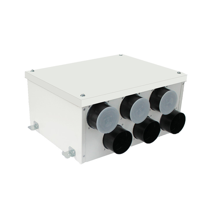 Horganyzott acéllemezből készült központi hővisszanyerős szellőztető rendszereknél alkalmazható osztó - gyűjtő elem 1 db 150 mm-es átmérőjű csőcsatlakozással és 6 db 75 mm átmérőjű csatlakozással, akusztikus szigeteléssel. A 150 mm-es csatlakozás a központi szellőztető készülékkel köthető össze ugyanilyen átmérőjű légtechnikai csővel, a kisebb méretű csatlakozási pontokat az egyes befúvási vagy elszívási pontokkal köthetők össze 75 mm külső átmérővel rendelkező, a kívánt méretben méretre vágott antibakteriális és antisztatikus légtechnikai csövekkel. Ez az osztóelem maximum 6 szellőztetési pont kialakítását teszi lehetővé.