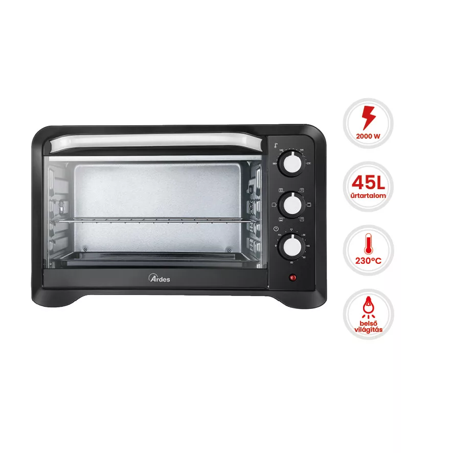 Különböző sütési módok a tökéletes eredményekértAz ARDES 6245PB sütési funkciói nem csupán sokoldalúak, hanem kifejezetten praktikusak is, hiszen minden ételt a hozzá legjobban illő hőkezeléssel készíthet el. A felső sütés kimondottan alkalmas grillezett halak, szaftos steakek, csirkehúsok vagy sertéskaraj elkészítésére, ahol fontos a ropogós, pirult felszín. Az alsó sütés kíméletesebb és egyenletesebb hőleadásával ideális desszertekhez, piskótákhoz és omlós süteményekhez, biztosítva, hogy az édességek alja ne égjen meg, hanem szépen átsüljön. Az alsó és felső sütés kombinációja kiválóan működik kenyerekhez, lepényekhez és pizzákhoz, hiszen egyformán pirítja és emeli meg az étel teljes felületét, így a tészta ropogós, a belseje pedig légiesen puha marad.Egyszerű kezelhetőség és pontos hőszabályzásA mechanikus forgókapcsolókkal működtethető vezérlés rendkívül megbízható és áttekinthető. A hőfok 100 és 230 °C között bárhová beállítható, így minden recepthez megtalálható az ideális beállítás. A 60 perces időzítő automatikus kikapcsolással és hangjelzéssel gondoskodik a biztonságos használatról, miközben leveszi Önről a folyamatos felügyelet terhét. A készülék csúszásmentes lábakkal és praktikus tepsi-fogóval is rendelkezik, amelyek még kényelmesebbé teszik a mindennapi használatot.Erős teljesítmény és hosszú távú megbízhatóságA 2000 wattos teljesítmény gyors felmelegedést és hatékony sütést garantál, a négy fűtőszál pedig egyenletes hőeloszlást biztosít. A készülék prémium anyaghasználata és gondos tervezése hosszú éveken át szolgálja tulajdonosát, amit a 4 év garancia is megerősít (2 év alapgarancia + 2 év regisztráció esetén). Ez a mini sütő nemcsak praktikus alternatívája lehet egy beépíthető sütőnek, hanem akár teljes értékű helyettesítője is.Kiegészítők, amelyek megkönnyítik a konyhai munkátA készülékhez egy nagyméretű sütőtepsi, egy grillrács és egy kényelmes tepsi-fogó is tartozik, így akár azonnal használatba vehető különféle ízletes falatok elkészítéséhez. A 40,3 × 31 cm-es tepsi ideális méret akár nagyobb adagokhoz is, legyen szó süteményekről, húsokról vagy zöldségekről.Megbízhatóság és élmény egy készülékbenAz ARDES 6245PB mini sütő nem csupán egy praktikus konyhai eszköz: egy olyan társ a mindennapokban, amely megkönnyíti a főzést, élvezetesebbé teszi a sütést, és hosszú távon megbízható teljesítményt nyújt. A gondosan megtervezett funkciók, az elegáns kivitel és a kivételes kapacitás mind hozzájárulnak ahhoz, hogy Ön mindig finom és tökéletesen elkészített ételeket tehessen az asztalra.Próbálja ki az ARDES 6245PB nyújtotta kényelmet és megbízhatóságot, és tegye egyszerűbbé, gyorsabbá és élvezetesebbé a sütést saját konyhájában.