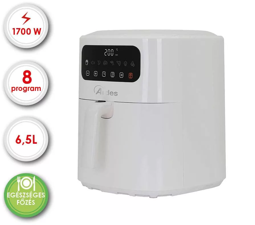 Modern technológia, amely megkönnyíti a mindennapokatAz ARDES ARFRYA01 Air Fryer forrólevegős sütő a legkorszerűbb Rapid Air technológiát alkalmazza, melynek lényege, hogy a forró levegő 360°-ban kering a sütőtérben. Ennek köszönhetően az ételek egyenletesen sülnek át, kívül ropogós kéreggel, belül pedig megőrzik omlós, szaftos állagukat. Az olaj használata akár 80%-kal is csökkenthető, így a megszokott ízeket egészségesebb formában élvezheti – legyen szó hasábburgonyáról, húsokról, zöldségekről vagy akár édességekről.Kiváló teljesítmény és energiatakarékosságA 1500–1700 wattos teljesítményű készülék gyorsan felmelegszik, így nincs szükség hosszú előmelegítési időre, ami nemcsak kényelmes, de energiát is megtakarít. A Rapid Air rendszer hatékony levegőkeringetése gondoskodik arról, hogy minden falat tökéletesen átsüljön, miközben az energiafelhasználás minimális marad. Az állítható hőmérséklet (80–200 °C) és az állítható termosztát lehetővé teszi, hogy minden étel pontosan a megfelelő hőfokon készüljön el, így a végeredmény mindig ízletes és tökéletes állagú legyen.Tágas, mégis praktikus kialakításA 6,5 literes kivehető kosár bőséges helyet biztosít akár két fő számára is, ugyanakkor kompakt mérete révén könnyedén elfér a konyhapulton. A kivehető kosár egyszerűen tisztítható, így a sütés után sem kell hosszasan bajlódni a takarítással. Az érintővezérlés és a digitális kijelző segíti a könnyű kezelhetőséget, így minden beállítás gyorsan és pontosan elvégezhető, még azok számára is, akik a hagyományos eszközöket részesítik előnyben.Biztonság és megbízhatóság minden használat soránA készülék hideg tapintású külső falai gondoskodnak a biztonságos használatról, így nem kell tartani az égési sérülésektől. A csúszásmentes lábak stabilitást biztosítanak működés közben, így a sütő mindig biztosan áll a helyén, még intenzív használat során is. Az olaz ARDES termékei a megbízhatóság és tartósság jegyében készülnek, amit a 4 év garancia (2 év alap + 2 év regisztráció esetén) is bizonyít.Intelligens programok a tökéletes eredményértAz 8 előre beállított sütési program segítségével egyetlen érintéssel választhatja ki a megfelelő beállítást különböző ételekhez. Akár aranybarnára sült burgonyát, omlós csirkét, grillezett zöldséget vagy ínycsiklandó desszertet készít, a készülék automatikusan optimalizálja a hőmérsékletet és a sütési időt. Így a végeredmény mindig egyenletes, ropogós és finom lesz – minden alkalommal.Egészséges életmód kompromisszumok nélkülAz ARDES ARFRYA01 nem csupán egy konyhai eszköz, hanem az egészséges életmód egyik kulcsa. A kevesebb olajhasználat révén csökkenthető a kalóriabevitel, miközben az ételek megőrzik természetes ízüket és tápanyagtartalmukat. Ez a forrólevegős sütő azok számára ideális választás, akik odafigyelnek egészségükre, de nem szeretnének lemondani a finom, házias ízekről.Elegáns megjelenés, amely illik minden konyhábaA fehér színű, elegáns kivitel eleganciát kölcsönöz a készüléknek, amely bármilyen konyhai környezetben megállja a helyét. Letisztult formája, digitális kijelzője és modern megjelenése azt az érzést kelti, hogy a technológia és az esztétika tökéletes harmóniában dolgozik együtt az Ön kényelméért.Megbízható társ az egészséges, ízletes és kényelmes sütéshezAz ARDES ARFRYA01 Air Fryer forrólevegős sütő a modern technológia, az energiatakarékos működés és a könnyű kezelhetőség tökéletes ötvözete. Segítségével egyszerre élvezheti az egészséges ételek előnyeit és a hagyományos ízek varázsát – mindezt gyorsan, biztonságosan és kényelmesen.