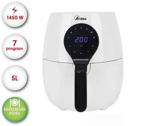 ARDES ARFRYA07 Air Fryer forrólevegős sütő – az egészséges, kényelmes és ízletes otthoni sütés új élményeModern technológia az egészségesebb ételekértAz ARDES ARFRYA07 Air Fryer forrólevegős sütő a hagyományos olajsütők és sütők modern, egészségtudatos alternatívája. A Rapid Air technológia lényege, hogy a forró levegőt Turbo Cyclonic Air rendszer keringeti az étel körül, így az egyenletesen és gyorsan sül meg – akár 80%-kal kevesebb olaj felhasználásával, vagy akár teljesen olaj nélkül. Az eredmény kívül ropogós, belül omlós étel, amely megőrzi az alapanyagok természetes ízét és tápértékét, miközben jóval kevesebb zsiradékot tartalmaz.Kényelmes és biztonságos használat minden napA készülék digitális érintővezérléssel és világos, könnyen olvasható kijelzővel rendelkezik, így a működtetése rendkívül egyszerű és intuitív. Az állítható időzítő (0–60 perc) és hőmérsékletszabályozás (80–200 °C) lehetővé teszi, hogy minden ételt pontosan az igényei szerint készítsen el. Az 5 literes, kivehető tapadásmentes kosár ideális akár két fő részére is, így tökéletes választás kisebb háztartások vagy párok számára. A kivehető, 22 cm átmérőjű kosár mosogatógépben is mosható, ami nagymértékben megkönnyíti a tisztítást, a hideg tapintású külső burkolat és a csúszásmentes lábak pedig biztonságos használatot garantálnak még forró üzemmódban is.Sokoldalú megoldás a mindennapi konyhai kihívásokraAz ARDES ARFRYA07 nem csupán egy forrólevegős sütő – egy sokoldalú konyhai segítőtárs, amely kiválóan alkalmas hasábburgonya, húsételek, zöldségek vagy akár desszertek elkészítésére is. A 7 előre beállított sütési program automatikusan gondoskodik a tökéletes hőmérsékletről és időzítésről, így minden alkalommal egyenletes és ízletes eredményt biztosít. Az állítható termosztát segítségével pedig teljes mértékben személyre szabhatja a sütési folyamatot, hogy az ételek pontosan az Ön ízlésének megfelelően készüljenek el.Energiatakarékos és környezettudatos működésAz 1450 W teljesítményű ARDES ARFRYA07 Air Fryer hatékonyan használja fel az energiát, így jelentősen kevesebb áramot fogyaszt, mint egy hagyományos sütő. A gyors felfűtés és a precíz hőelosztás nemcsak időt, hanem energiát is megtakarít, miközben az ételek elkészítése rövidebb idő alatt történik meg. Ezáltal a készülék hosszú távon gazdaságos és fenntartható megoldást nyújt mindazok számára, akik a modern technológia előnyeit a felelősségteljes energiahasználattal szeretnék ötvözni.Elegancia és megbízhatóság az otthon középpontjábanAz elegáns fehér külső borítás időtálló eleganciát kölcsönöz a készüléknek, amely bármely konyhába harmonikusan illeszkedik. Az ARDES márka a megbízhatóság és tartósság szinonimája: a termék 4 év garanciával (2 év alap + 2 év regisztráció esetén) biztosítja, hogy hosszú éveken át elégedettséggel használhassa. Az ARDES ARFRYA07 nem csupán egy konyhai eszköz, hanem egy kényelmet és egészséget támogató befektetés, amely megkönnyíti a mindennapi ételkészítést és hozzájárul egy tudatosabb életmódhoz.Az ARDES ARFRYA07 Air Fryer – a modern technológia és az egészséges élet harmóniájaHa fontos Önnek, hogy ételei ízletesek, egészségesek és könnyen elkészíthetők legyenek, az ARDES ARFRYA07 Air Fryer forrólevegős sütő ideális választás. A korszerű technológia, a kényelmes használat és az energiatakarékos működés együttese biztosítja, hogy minden étkezés öröm legyen – egyszerűen, gyorsan és kompromisszumok nélkül.