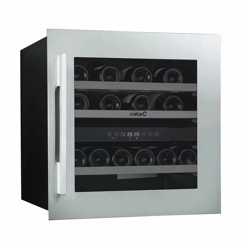 CATA - Beépíthető borhűtő VI-59036 X - Professzionális borhűtés No Frost technológiávalEz a beépíthető borhűtő ideális választás mindazok számára, akik komolyan veszik a borkezelést és fontosnak tartják a tökéletes tárolási körülményeket. A modern No Frost technológiának köszönhetően nem szükséges a készülék leolvasztása, így a tárolt borok mindig ideális klímában pihenhetnek.Kétzónás hőmérséklet-szabályozás a sokoldalú felhasználáshozA borhűtő két különálló hőmérsékleti zónával rendelkezik, amelyek 5–22 °C között állíthatók, így külön-külön is optimalizálhatók a különféle borfajták igényeihez. Az alsó zóna 5–13 °C között ideális fehérborokhoz (különösen a tölgyfaérlelés nélküli fajtákhoz), édes borokhoz, rozékhoz vagy pezsgőkhöz. A felső zóna 13–22 °C közötti tartománya a tölgyfahordós érlelésű fehérek és a vörösborok számára nyújt tökéletes feltételeket.Stílusos belső tér fa polcokkalA három darab elegáns fa polc nemcsak természetes megjelenést kölcsönöz a hűtő belső terének, hanem kíméletes tárolási felületet is biztosít a borospalackok számára. A belső LED világítás diszkrét fényével hangsúlyozza a palackok szépségét, miközben energiatakarékosan működik.Kényelmes vezérlés és sokoldalú beépítésAz elektronikus vezérlőrendszer és az áttekinthető LED kijelző egyszerűvé teszi a hőmérséklet beállítását, miközben a készülék csendes működésével (mindössze 39 dB zajszinttel) és 85 literes tárolókapacitásával kiválóan illeszkedik a modern konyhai környezetbe. A hűtőajtó nyitásirányát igény szerint jobbosra vagy balosra is be lehet állítani, így tökéletesen illeszthető bármilyen beépített elrendezéshez.Energiaosztály és környezeti jellemzőkA készülék G energiaosztályba tartozik, amely a borhűtők szegmensében gyakori kategória, tekintettel az állandó hőmérsékletszabályozás igényére. Beépíthető kivitele révén nemcsak esztétikus, de helytakarékos megoldást is kínál bármely konyhai vagy bárpult alá építve.