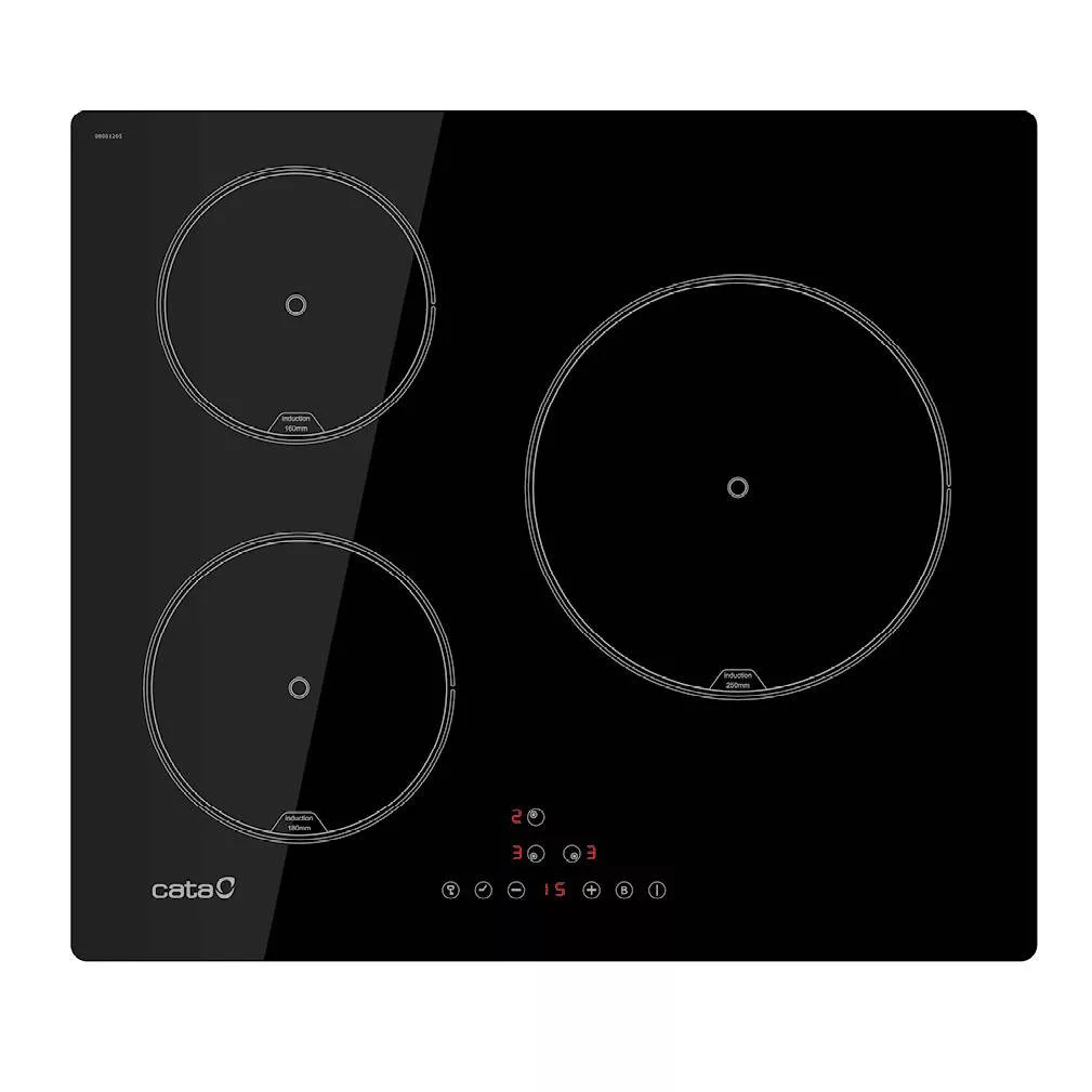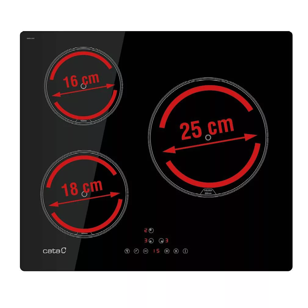 3 Indukciós főzőzóna, MACH2 indukciós technológia, Touch Control érintővezérlés, 9 fokozat, 1 db 25 cm-es BOOSTER funkcióval, 1 db 18 cm-es és 1 db 16 cm-es főzőzóna, 3 főzési funkció: olvasztás (45-55ºC), melegítés, melegen tartás (65-70 ºC), forralás (85-95ºC), gyerekzár, időzítő, maradékhő kijelzés, automata kapcsolat, Quick-Fix system, teljesítmény: 5,3 kWteljesítmény:1 db 250 mm-es zóna: 1,8 kW (BOOSTER 2,3 kW)1 db 180 mm-es zóna: 1,8 kW 1 db 160 mm-es zóna: 1,5 kWÚj fejlesztésű MACH2 belső szellőző rendszer a készülék és a bútor védelmére. A rendkívül halk működésű axiális ventilátor nagy felületen szívja be a hűvös levegőt. Majd a két oldalsó megnövelt szellőzőcsatornán fújja ki. Az oldalsó kivezetésnek köszönhetően nincs szükség nehezen kialakítható szellőzőnyílásra a bútor elején.Mach2 indukciós technológia előnyei:Csendes működésOptimalizált csendes szellőztető rendszer. Új elrendezés. A szokásos két centrifugális ventilátor helyett Egyetlen axiális ventilátor alacsony fordulatszámmal és megnövelt elszívófelülettel. 6 dB-lel alacsonyabb zajszint.Könnyen telepíthetőCsak helyezze a főzőlapot a munkalap kivágásba, nincs szükség csavarra és szerszámokra. A rögzítő klipszek fixen és stabilan tartják a főzőlapot. Csak 5 mm távolság szükséges a főzőlap és a szekrény/sütő között. Nincs szükség elülső ventilátorra. A főzőlapot 1,2 és 3 fázisra is csatlakoztatható.Folyamatos egyenletes teljesítményA főzőfelület hője olyan stabil, hogy egyenletes főzést és sütést érhetünk el, bármilyen edényt használunk és bármilyen ételt főzünk. A főzőlap képes folyamatosan magas teljesítményt tartani.Csökkentett és hatékony energiafogyasztás1 liter víz egy 20 cm-es edényben 20º-ról 3 perc alatt forralható fel.(100 g. tészta, rizs...2 személyre)1 liter olajat egy 28 cm-es serpenyőben 20º -ról 180º -ra 5 perc alatt melegíthető fel.(Készen áll a burgonya sütésére)Automatikus edényérzékelési sebességAz edény észlelésének az ideje: 2-3 másodperc a 7-es vagy magasabb teljesítményszintnél, 3-6 másodperc az alacsonyabb teljesítményszinteknél.Automata kapcsolat (Hob to Hood)A CATA mérnökei egy új funkcióval láttak el bizonyos elszívókat és főzőlapokat, ami egy bluetooth kapcsolatot hoz létre a két készülék között és automatikusan szabályozza a páraelszívó teljesítményét a főzés intenzitásához képest.Maradékhő kijelzésEgí figyelmeztető jelzés ami addig világít amíg az adott főzőzóna kihűl.Folyamatos teljesítményszintBármilyen teljesítményszintet is választunk a főzés folyamán, a kerámialap szabályozásának köszönhetően az folyamatosan stabil és egyenletes marad.IdőzítőEz a funkció lehetőséget ad a felhasználónak, hogy különböző zónákon beállítsa a főzési időt. Ha a beállított idő letelik, a főzőlap egy hangjelzés kiséretében kikapcsol.Automata kikapcsolásA főzőlap kikapcsolása 20 másodperc inaktivítás után.BOOSTEREgy olyan funkció mely arra hivatott, hogy a kiválasztott főzőzóna teljesítményét növelje meg. Így nagyobb mennyiséget, gyorsabban felforral.Quick-Fix systemGyorsrögzítő rendszer, amely megkönnyíti a főzőlap beszerelését a munkapultba.