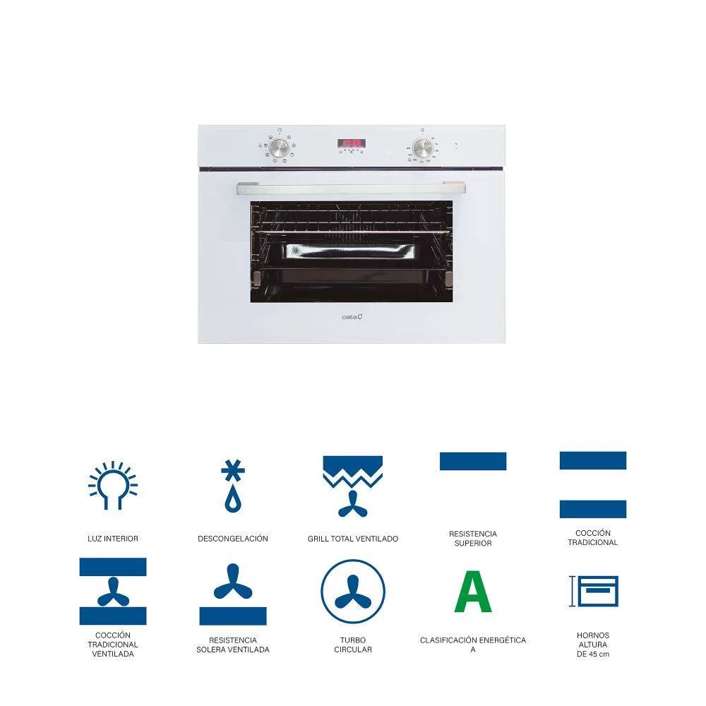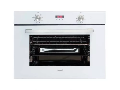 Kompakt méretű sütő (45 cm magas), 8 sütőfunkció, süllyesztett gombok, programozható digitális óra, 40 literes sütőtér, sütővilágítás, állítható hőfok 50-250 ºC, 4 szint a tálcák elhelyezéséhez, tripla üvegezésű sütőajtó, fehér üveg előlap, 1 db kihúzható sütősín, 1 db mély tepsi (5 cm), 1 db grillrácsKOMPAKT SÜTŐA kompakt sütők ideálisak a kisebb háztartások számára 45 cm magasságuknak köszönhetően. Előnyük a kompakt méret, a gyors fűtőteljesítmény és az elegáns kialakítás. Kis méretük ellenére egyes modellek rendelkeznek a klasszikus sütők prémium jellemzőivel.KIVEHETŐ SÜTŐAJTÓ ÜVEGA cata sütőknek a belső sütő üvege kivehető, így a tisztításuk egyszerű és gyors.SÜTÉSI SZINTEKA sütőtérben 3,4 vagy 5 szinten elhelyezhető sütőtálcák.KIHÚZHATÓ SÜTŐSÍNMi sem egyszerűbb annál, mint a teleszkópos sütősín segítségével megnézni az ételeket anélkül, hogy a tepsit vagy a rácsot kivennénk a sütőből és rátennénk a lehajtott sütőajtóra. A sütősín biztonságossá és könnyűvé teszi az ételekkel teli tepsi vagy rács használatát.AQUASMART....Takarítson meg időt és pénzt a Cata AQUASMART rendszerének köszönhetően. Öntsön egy pohár (200ml) vizet egy kávéskanál mosogatószerrel a sütőtér alsó részére, válassza ki a sütőn az AQUASMART funkciót, 15 percen át üzemeltesse a sütőt majd hagyja kihűlni, utána törölje ki a sütőteret egy szivaccsal és a sütőtér már tiszta is!