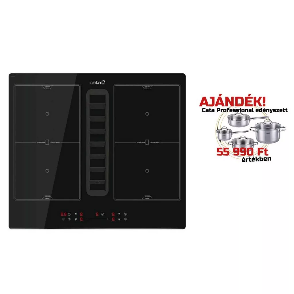 A CATA IAS-6024 Indukciós kerámialap egyedi tulajdonságai:60 cm széles, 4 db 21,5 x 19 cm-es cm-es vagy 2 db 21,5 x 38 cm-es moduláris főzőzóna, SLIDER érintővezérlés kikapcsolási időzítvel és szűrőtisztítás kijelzéssel, 9 fokozat + BOOSTER funkció minden zónához, gyerekzár, időzítő, maradékhő visszajelzés, automata kikapcsolás hangjelzéssel, automata edényfelismerés, automata főzési funkciók (kiolvasztás, melegen tartás, párolás), folyamatos teljesítmény szabályozás, maximum teljesítmény: 7,4 kWMaradékhő kijelzésEgy figyelmeztető jelzés ami addig világít amíg az adott főzőzóna kihűl.IdőzítőEz a funkció lehetőséget ad a felhasználónak, hogy különböző zónákon beállítsa a főzési időt. Ha a beállított idő letelik, a főzőlap egy hangjelzés kiséretében kikapcsol.Automata kikapcsolásA főzőlap kikapcsolása 20 másodperc inaktivítás után.BOOSTEREgy olyan funkció mely arra hivatott, hogy a kiválasztott főzőzóna teljesítményét növelje meg. Így nagyobb mennyiséget, gyorsabban felforral.