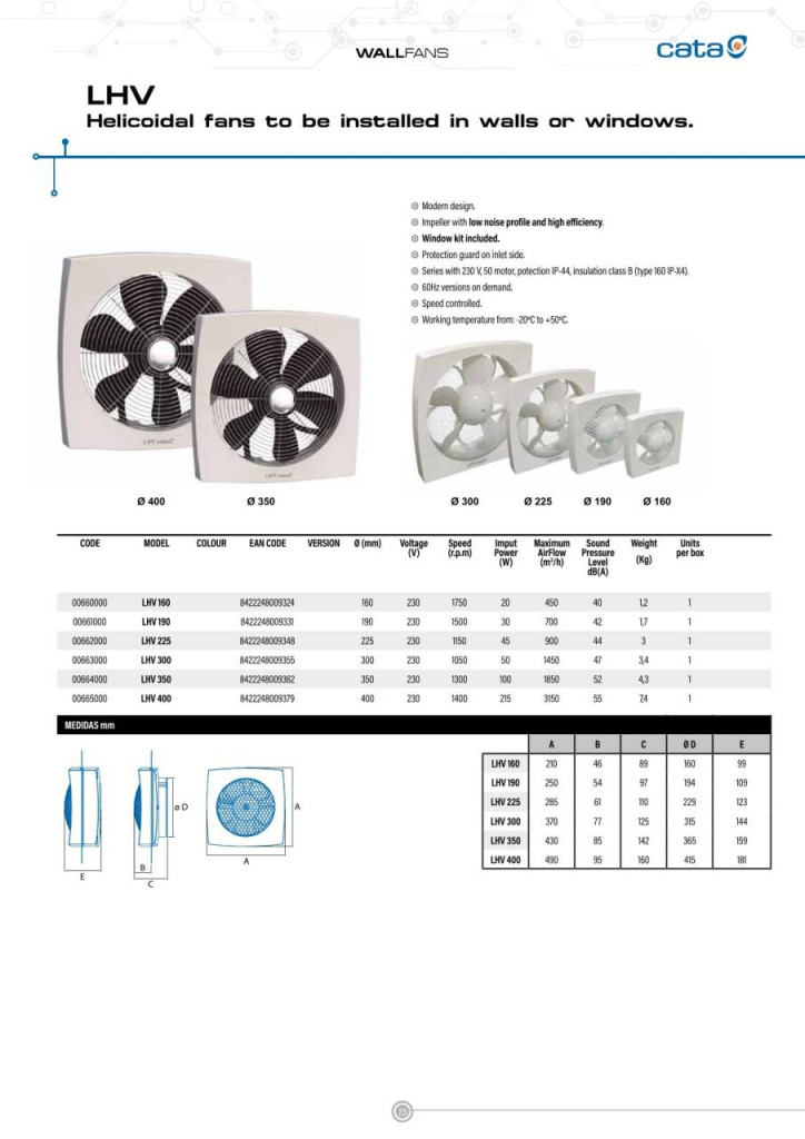 A Cata LHV nagy teljesítményű szellőztető ventilátorok hagyományos kialakítású, védőráccsal szerelt előlappal, nagy hatékonyságú, alacsony zajszintű lapátozással rendelkeznek. Kiválóan alkalmas nagyobb helyiségek általános szellőztetésre.