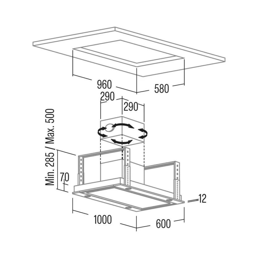 Cata Isla Sirin GWH mennyezetbe építhető elszívó, forgatható extra csendes BT3 motorral, így minden oldalon van kivezetési lehetőség. Vezérlés távvezérlővel történik (3+1 TURBO fokozat). A készülék rendelkezik zsírszűrő-telítettség kijelzővel, ami jelzi, hogy a zsírszűrőket tisztítani kell. Kivehető, mosható fém zsírfilter. Az elszívónak a középső panelje fehér üveg, a keretrész fehérre festett acél.