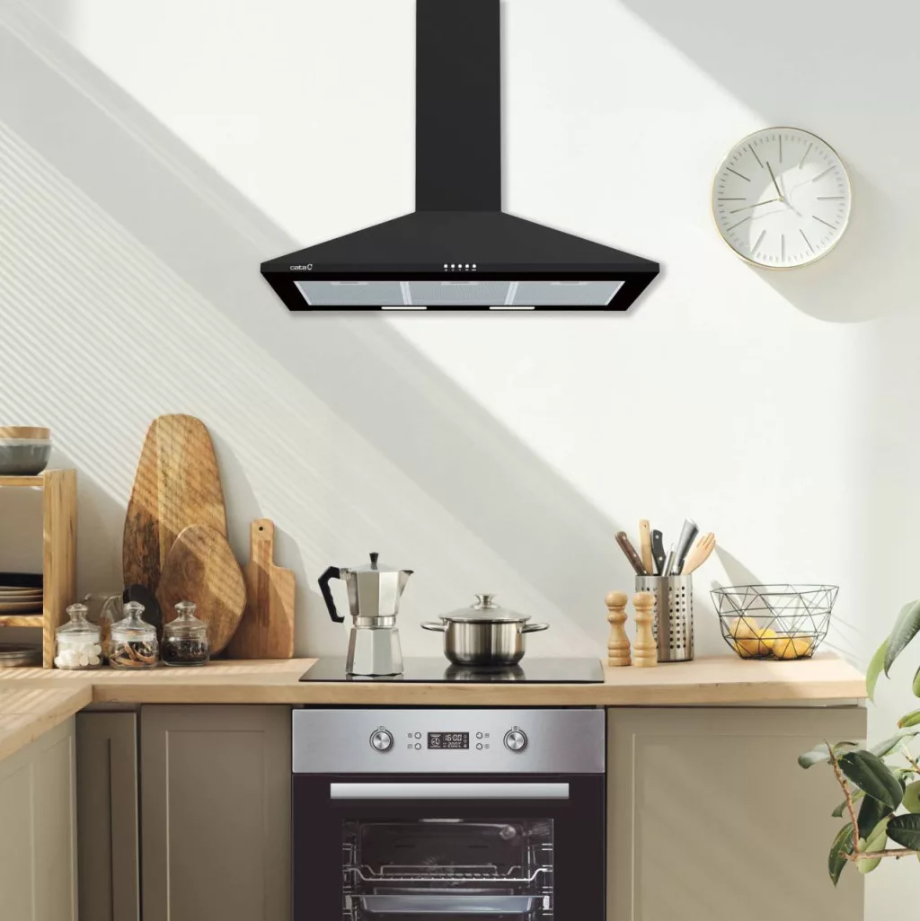 A lenyűgöző Cata Omega sorozat tökéletesen illik a modern konyhák világába, és magas fokú kényelmet biztosít. Maximális légszállítása 1100/645 m³/óra. Képes működni légelvezetési és keringtetési módokban egyaránt. Az elvezetési mód esetén a pára a fém zsírszűrőn keresztül halad át, majd kivezetésre kerül. A beszennyeződött szűrőket meleg mosószeres vízben vagy mosogatógépben kell tisztítani. Keringtetési módban az elszívó nem csatlakozik a szellőzőcsőhöz, a friss levegő közvetlenül áramlik be a konyhába. A három sebességfokozatnak köszönhetően a páraelszívó hatékonyan működik kis- és nagy terekben egyaránt. Beépített LED világítással van felszerelve, két kis méretű lámpa biztosítja a megfelelő fényt. A munkafelület magas minőségű megvilágítása további kényelmet nyújt. A páraelszívóval való kommunikációt a mechanikus vezérlőpanel (nyomógombos) biztosítja.