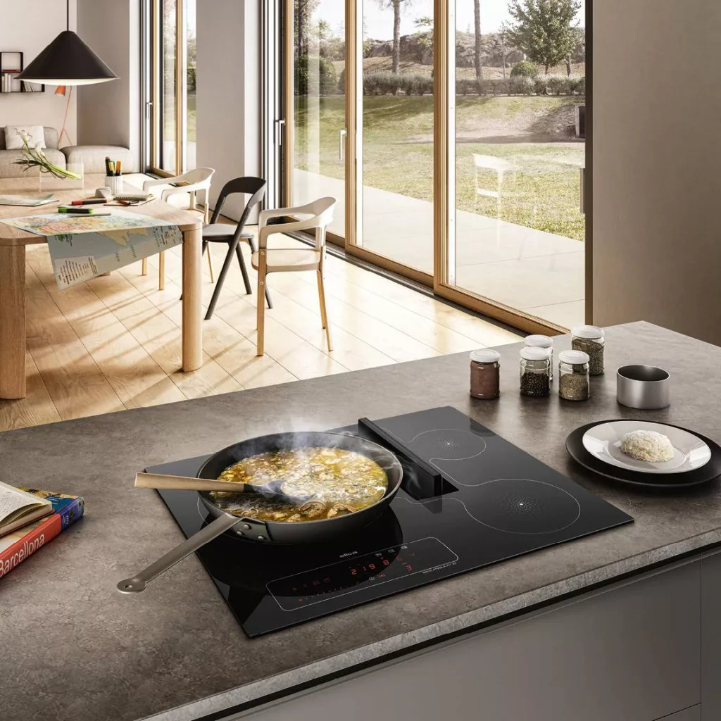 Ez az első 60 cm-es páraelszívós főzőlap a piacon, amely három zónával rendelkezik. Az egyik extra nagy, 30 cm széles, és lehetővé teszi, hogy könnyedén főzzön a család és a barátok számára.60 cm-es páraelszívós főzőlap extra nagy felülettel.Minőség a mennyiségben. Végre mindenki számára főzhet. A háromzónás elszívós főzőlapon elegendő hely van a nagyméretű serpenyőkkel, fazekakkal és lábasokkal való főzéshez. Az elszívórendszer láthatatlan, csendes, automatikus, és egyetlen érintéssel aktiválható. Zárva a készülék teljes, esztétikailag kivételes hatású linearitással rendelkezik. A fekete üveg és a kifinomult szitanyomás teszi teljessé a design stílusát, amely bármilyen konyhához igazítható. Az érintővezérlés rendkívül egyszerűvé teszi a főzőlap funkcióinak használatát, a rendkívül hatékony elszívó rendszer pedig elnyeli a szagokat és a gőzöket. A hosszú élettartamú szagszűrők könnyen kivehetők, és egy speciális szelepen keresztül a kiömlött folyadékok leereszthetők a teljes higiénia érdekében.Indukciós főzőlap egyedi tulajdonságok:3 indukciós főzőzóna, érintővezérlés piros LED kijelzéssel,4+1 fokozat, teljesítmény: 7,2 kW1 db 300/180 mm-es főzőzóna - 2,5/3,6 kW - 2,1/2,8 kW1 db 180 mm-es kerek főzőzóna - 1,4/2,8 kW1 db 140 mm-es kerek főzőzóna - 0,9/1,35 kWExtralarge Zone - Extra nagy főzőzónaNagy teljesítmény és nagy méretek. Ez a főzőzóna a megoldás a nagyméretű, akár 30 cm átmérőjű edényekhez. Nagyszerű megoldás, ha gyorsan kell főzni. Nagyobb teljesítménnyel rendelkezik, mint a hagyományos indukciós főzőlapokon lévő zónák.Dual Zone - Kétkörös főzőzónaAz ideális megoldás minden edényhez. A kerámialap két koncentrikus zónája egymástól függetlenül aktiválható. A középsőt a kisebb edényekhez, és mindkettőt a nagyobb edényekhez, illetve a WOK serpenyőkhöz.