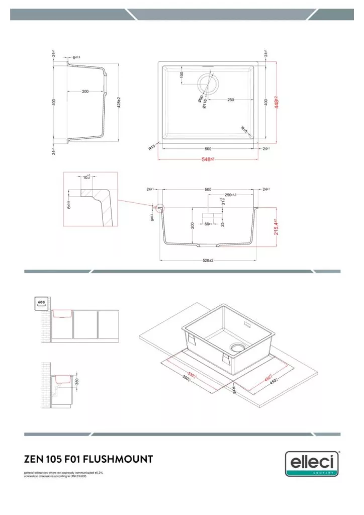 Letisztult forma és időtlen eleganciaAz ELLECI Zen-F 105 Keratek mosogatótálca a minimalista konyhák tökéletes választása. A K86 Black Champagne árnyalat elegáns, sötét tónusával harmóniát visz a térbe, miközben kiemeli a modern konyhák letisztult vonalvezetését. A szintbe szerelhető kialakítás kifinomult megjelenést kölcsönöz, hiszen a tálca pereme egy síkban fut a munkalappal – ezáltal nemcsak esztétikus, hanem higiénikus is, hiszen nem gyűlik meg a víz vagy a szennyeződés a széleken. A 548x448 mm-es méret és a 200 mm-es mélység ideális arányt biztosít, a megfordítható medencekialakítás pedig lehetővé teszi, hogy a tálca bármelyik oldalra tökéletesen illeszkedjen.Keratek Plus – Maximális ellenállás és tartósságAz ELLECI Zen-F 105 alapját a Keratek Plus technológia adja – egy prémium anyag, amely a design és a tartósság tökéletes összhangját képviseli. Ultrakompakt szerkezete nagy felületi keménységet biztosít, így a mosogató ellenáll a karcolásoknak, hősokknak, ütődéseknek, valamint az UV-sugárzásnak is. A Keratek 100%-ban vízlepergető és foltálló, selymesen sima felülete pedig könnyen tisztítható, így a mosogató hosszú éveken át megőrzi eredeti fényét és eleganciáját.