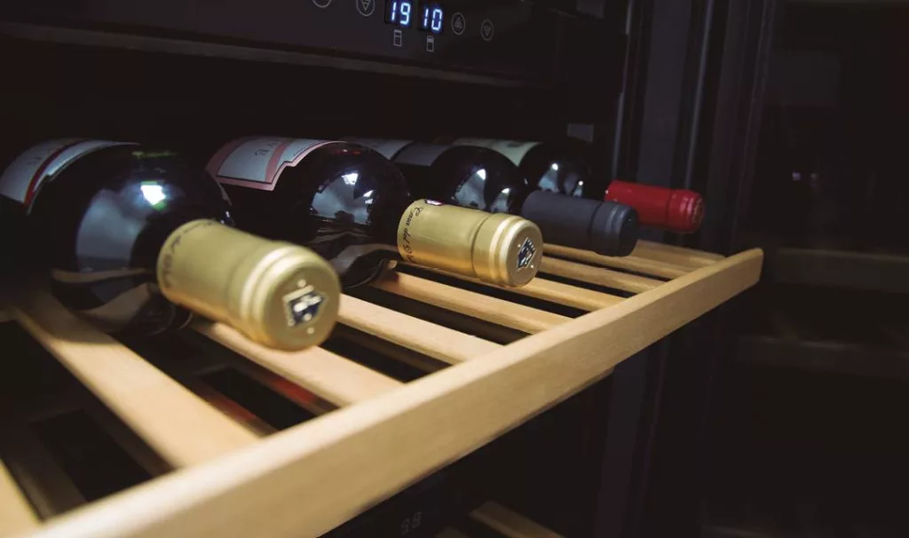 24 palack tárolása 3 db fa polcon, elektronikus érintővezérlés, 1 hűtési zóna, fekete üveg előlap, lágyan záródó ajtó, 43 dB(A) zajszint, LED világítás