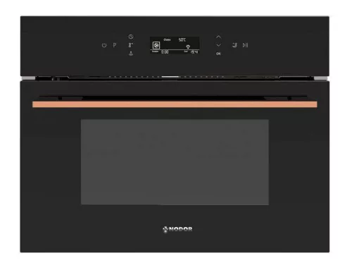 multifunkciós mikrohullámú sütő, 40 literes űrtartalom, dupla üvegezésű ajtó, 3 szinten elhelyezhető tálcák, 1 db 75%-ban kihúzható sütősín, 1 db mély tepsi (5 cm), 1 db normál tepsi, 1 db rács, 1000W, kvarc grill 1400W, touch control érintővezérlés, 8 program, súlyautomatika, automata kiolvasztás, LED kijelző, gyerekzár, „A” energiaosztály, teljesítmény: 3,2 kW, fekete üveg előlap réz fogantyúval, Softclose - lágyan záródó ajtó