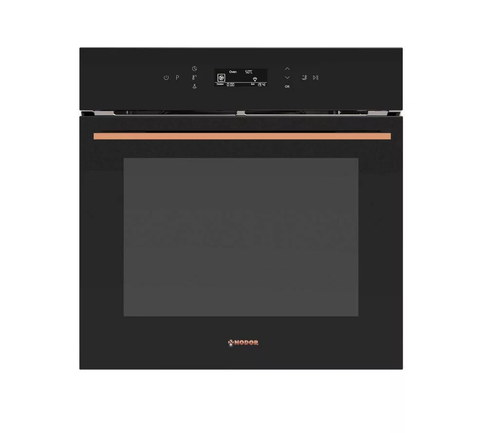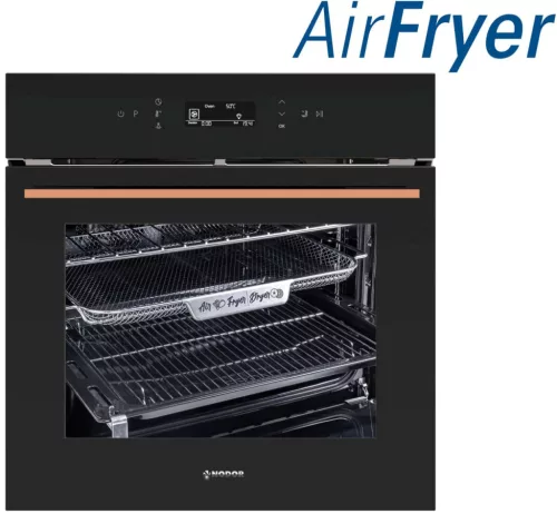 A NODOR új sütői és kompakt készülékei jól példázzák a formatervezés és a használhatóság közötti egyensúlyt. A minimalizmus sosem kerül ellentétbe a funkcionalitással, köszönhetően a teljesen sima, díszítőelemek nélküli fogantyúfrontoknak, amelyek megkönnyítik a tisztítást, valamint az egyszerű érintésvezérlés, ami segíti a használatukat. A NODOR új sütőinek és kompakt készülékeinek egyik különleges eleme a fogantyú, amely nem csak krómozott vagy rézből készült, hanem ergonomikus és robusztus jellege miatt is, amely minden egyes háztartási készülék formáját kiemeli.NODOR MO-6800 CU fekete AIR FRYER beépíthető sütő esztétikus réz fogantyúval, 10 sütőfunkcióval, AIR FRYER sütési mód, érintővezérlés,állítható hőfok 50-250 ºC, 5 szint a tálcák elhelyezéséhez, 1 db 100%-ban kihúzható sütősín, 1 db tepsi, 1 db grillrács, tripla üvegezésű sütőajtó, Fast preheat, Nsoft, Nchild, Nhome-Baked, Nclean, Softclose door, 67 literes, fehér üveg előlap, réz fogantyú.Gyors ételek egészségesenHa egészségtudatosan szeretne étkezni, de nem szeretne lemondani a sült krumpliról és a rántott húsról, akkor a tökéletes választás az AIRFRYER sütő az Ön számára. Azonban nem csak sült krumplit és rántott húst készíthet a forrólevegős sütőben. Minden olyen étel, ami a légkeveréses sütőben elkészíthető, az air fryerben is megsüthető és kellő gyakorlattal akár egy jó steak is elkészíthető.A forrólevegős sütőben ugyanis minimális olajjal vagy akár olaj nélkül is elkészíthetők az ételek. A sütőben a sütést nem a forró olaj végzi, hanem a forró levegő: a meleget a fűtőszálak állítják elő és a ventilátor osztja el egyenletesen a sütőtérben. Az ételek így elhelyezkedésüktől függetlenül egyformán sülnek meg és a belőlük kiáramló gőz és pára sem szivárog vissza az ételekbe.Akár 80%-kal KEVESEBB olajhasználat! - ENERGIATAKRÉKOS SÜTÉS! - EGÉSZSÉGESEBB ÉTELEK!Speciális perforált sütőtálca (tartozék)Ehhez a sütési módhoz egy speciálisan kialakított perforált kosárszerű tepsi szükséges, amely lehetővé teszi a légáramlást a készülő étel körül. A forró levegővel történő sütés során az alapanyag körül nagy sebességgel keringtetett forró levegőnek köszönhetően készül el az étel. Nagyon kevés (akár 80 százalékkal) kevesebb olajjal vagy akár olajmentesen is süthet.NsoftAz Nsoft technológiájú sütők és mikrohullámú sütők a sütés során alkalmazott különböző sütési funkcióknak köszönhetően a legjobb sütési eredményt nyújtják.Fast PreheatGyorsfelfűtés - Maximális teljesítményen történő gyors indítás.Touch ControllHáttérmegvilágítású érintővezérlés.Belső világításA sütőtérben elhelyezett LED világítás.NchildA NODOR Törődik a biztonsággal otthonában, ezért az Nchild funkció megakadályozza az elektromos készülékek vezérlőinek véletlenszerű aktiválását, a vezérlés lezárásával.SoftcloseLágyan záródó sütőajtó.Nhome-bakedA Nodor új Nhome-sütő funkciójával a fakemencében sütött ételek hagyományos íze végre a kevésbé tapasztalt szakácsok számára is elérhetővé válik.NcomfortKönnyű hozzáférés az ételekhez. A sütőtérben 3,4 vagy 5 szinten elhelyezhető sütőtálcák. Bizonyos NODOR sütők rendelkeznek kihúzható teleszkópos sütősínnel, ami biztonságossá és egyszerűvé teszi az ételekkel teli sütőtepsik használatát. Mélytepsi5 cm mély sütőtepsi a nagyobb méretű vagy mennyiségű húsok, zöldségek és élelmiszerek sütéséhez.NcleanA Nodor új, könnyen tisztítható Nclean zománcával és csökkentett porozitásának köszönhetően a sütő és a sütőlapok tisztítása egyaránt egyszerű feladat. Ez az Ndamantium technológiával készült zománc kitűnik kiváló tartósságával, ütés- és karcállóságával a hasonló termékek közül. A sütője ugyanolyan jól fog kinézni, mint az első napon. Nagy sütőterében az egész család számára főzhet.